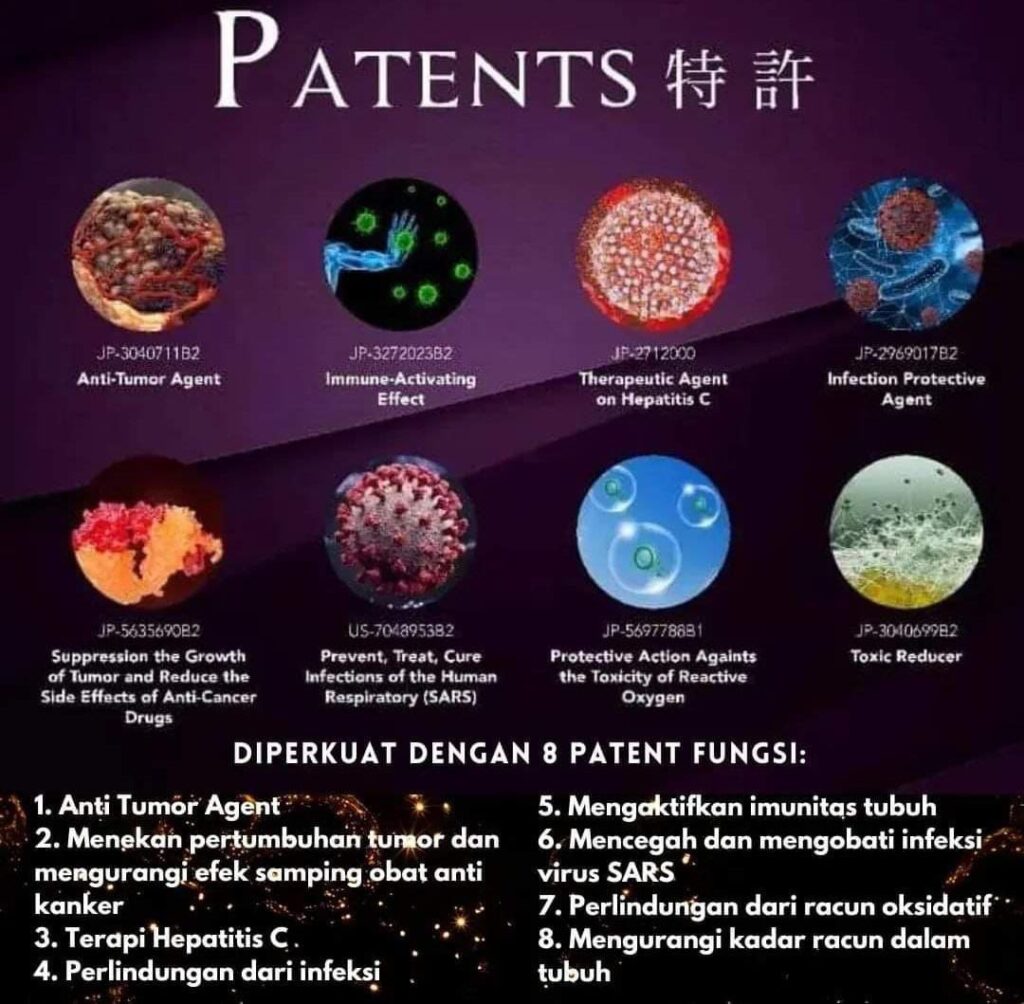 Produk ini telah memperoleh 8 paten internasional, termasuk dari Jepang dan Amerika Serikat, yang membuktikan efektivitasnya dalam: